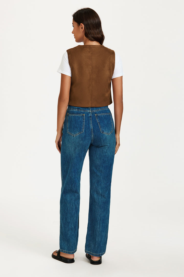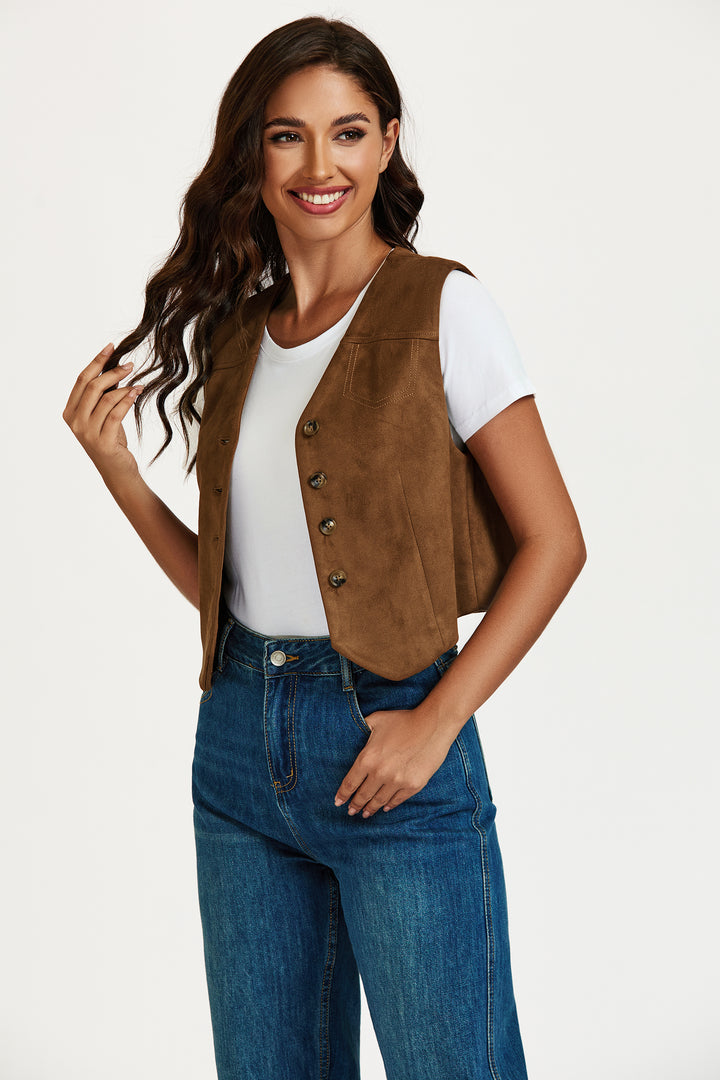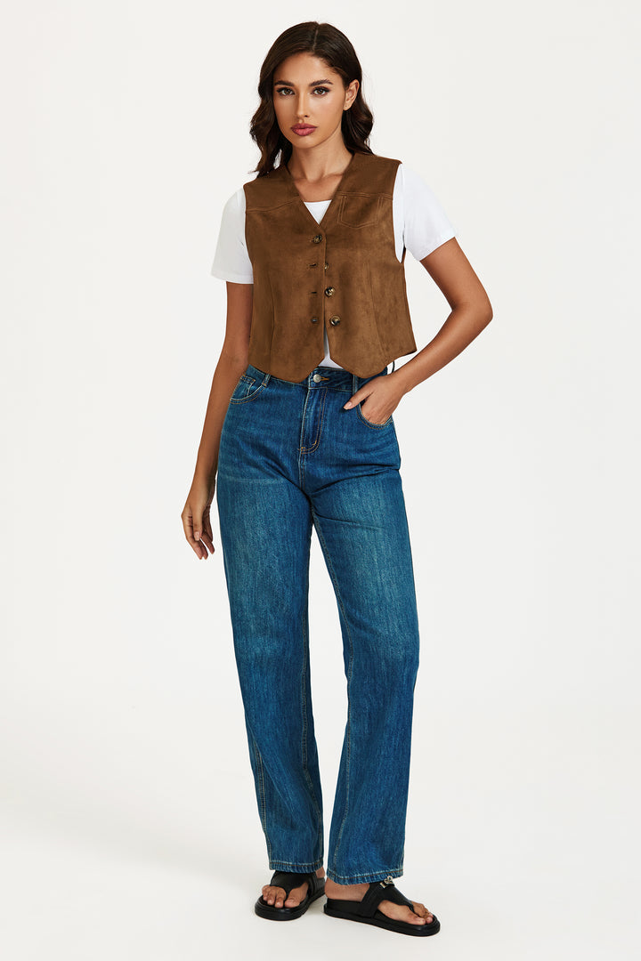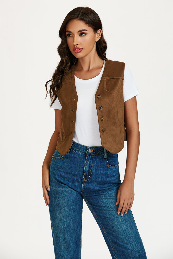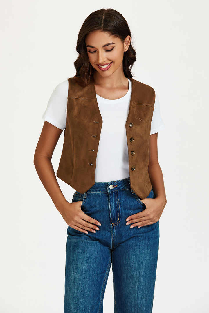 Channel effortless western-inspired charm with this classic faux leather vest. Crafted from soft-touch faux leather fabric, it features a flattering tailored silhouette with a pointed hem and button-up front. The rich brown tone adds warmth and versatility, making it easy to pair with everything from a crisp white tee and jeans to boho dresses. Finished with a subtle chest pocket detail, this sleeveless vest offers both structure and style for layering through the seasons. Perfect for transitional weather or adding a touch of vintage flair to your outfit.
