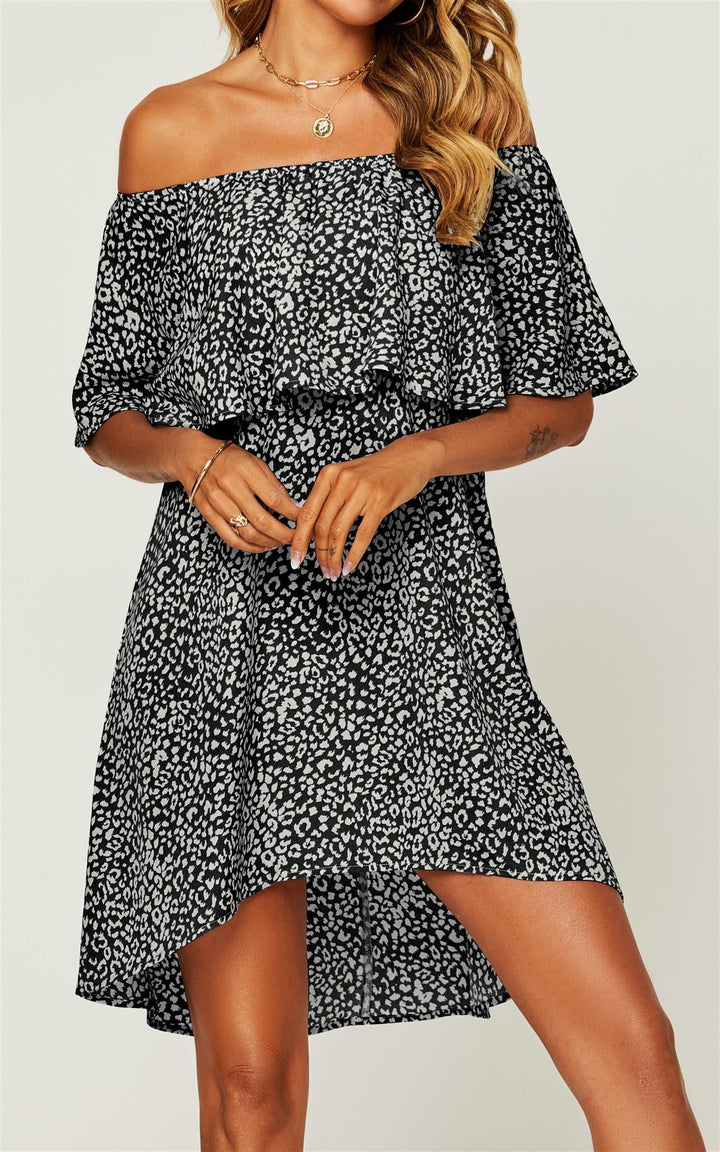 Leopard Print Bardot Frill Off Shoulder Mini Dress In Black