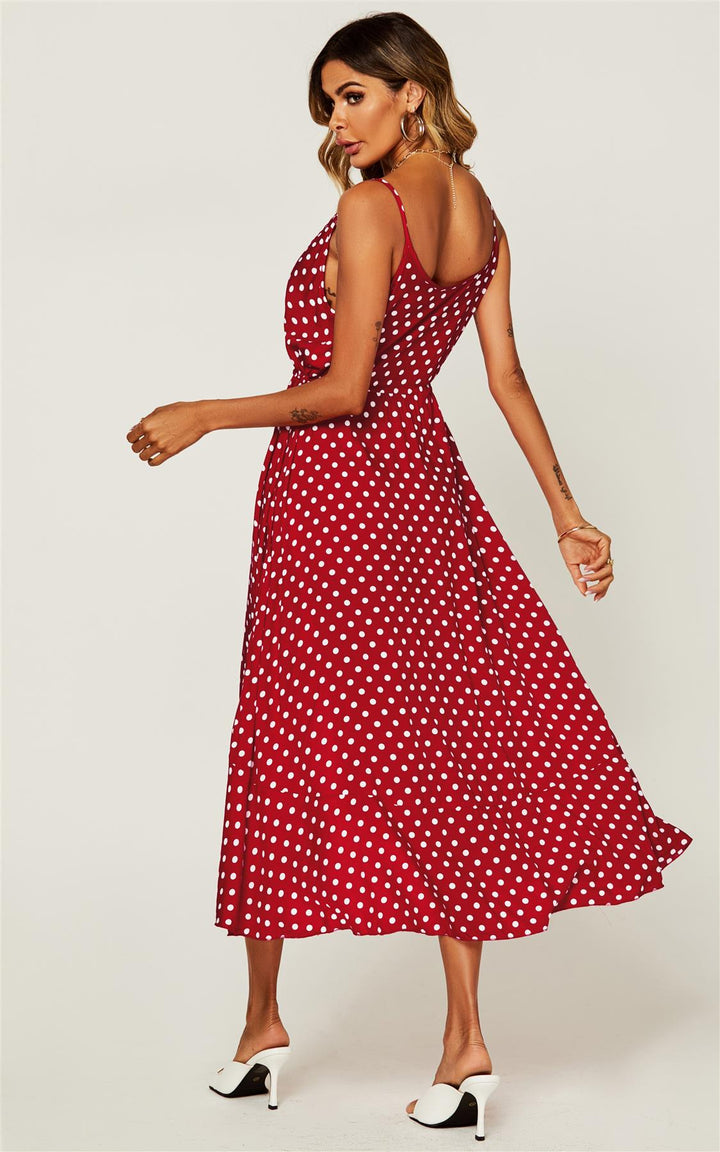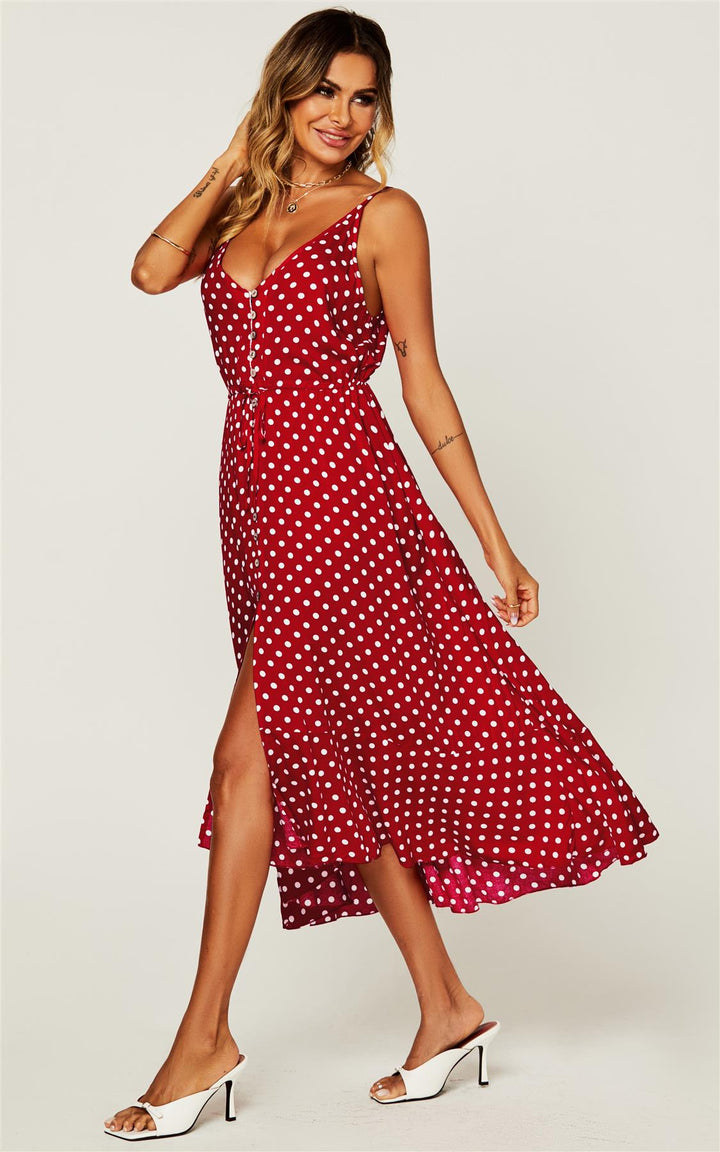 High-Low-Trägerkleid mit Knopfleiste in Weinrot und Weiß mit Punkten