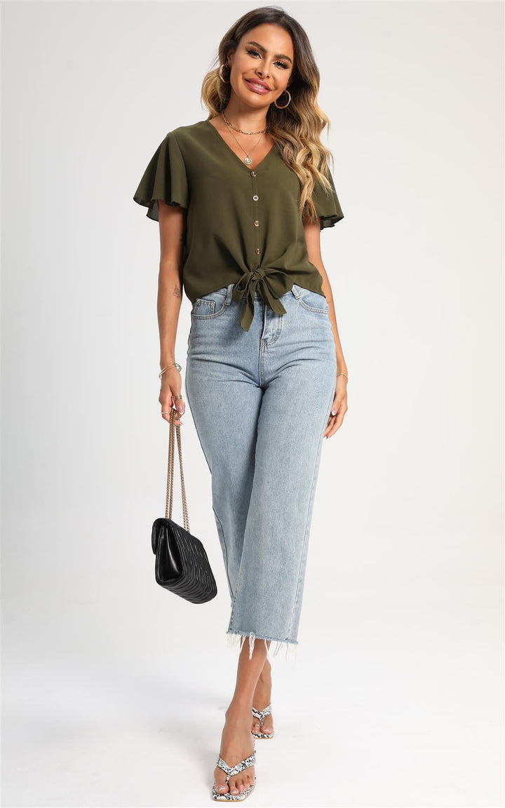 Süßes, geknöpftes, kurzes T-Shirt-Oberteil mit Knoten vorne in Olivgrün