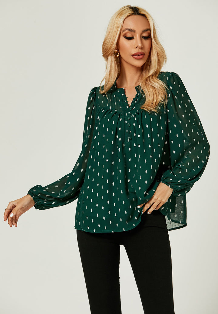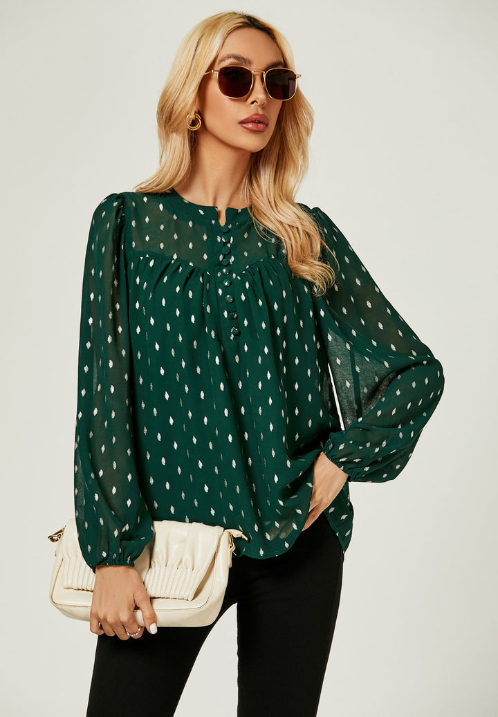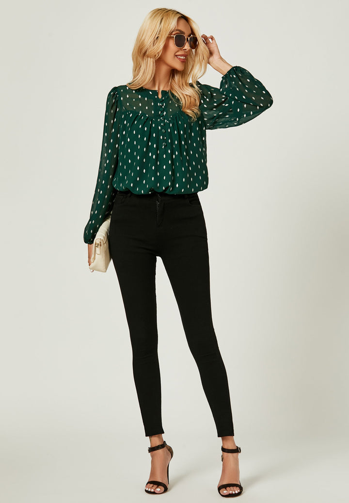 Langarmshirt aus geknittertem Tüll mit Goldfolienknöpfen in Dunkelgrün